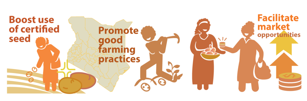 Potato is the second most important staple crop in Kenya and has the potential to replace maize as the top food crop. Potato is a poverty buster and a key crop for food security from a household to national level. The high market demand and value in rural and urban areas, coupled with quick production cycles, continue to drive the expansion of the crop. However, despite its role as one of Kenya’s strategic food commodities, the potato industry has continued to face challenges along the value chain. Among these are limited access to quality seed and suboptimal agronomic practices, both of which result in low yield and low quality, high pest and disease prevalence, poor marketing and distribution infrastructure, limited adoption of high-yielding varieties, overreliance on rain-fed conditions, and climate variability due to climate change.
