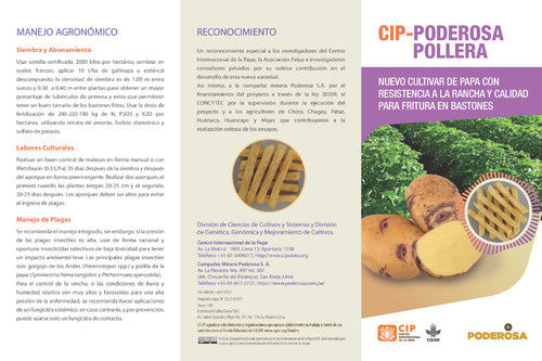 Citation: International Potato Center. CIP-Poderosa pollera. Nuevo cultivar de papa con resistencia a la rancha y calidad para fritura en bastones. Lima, Peru. 2 p.